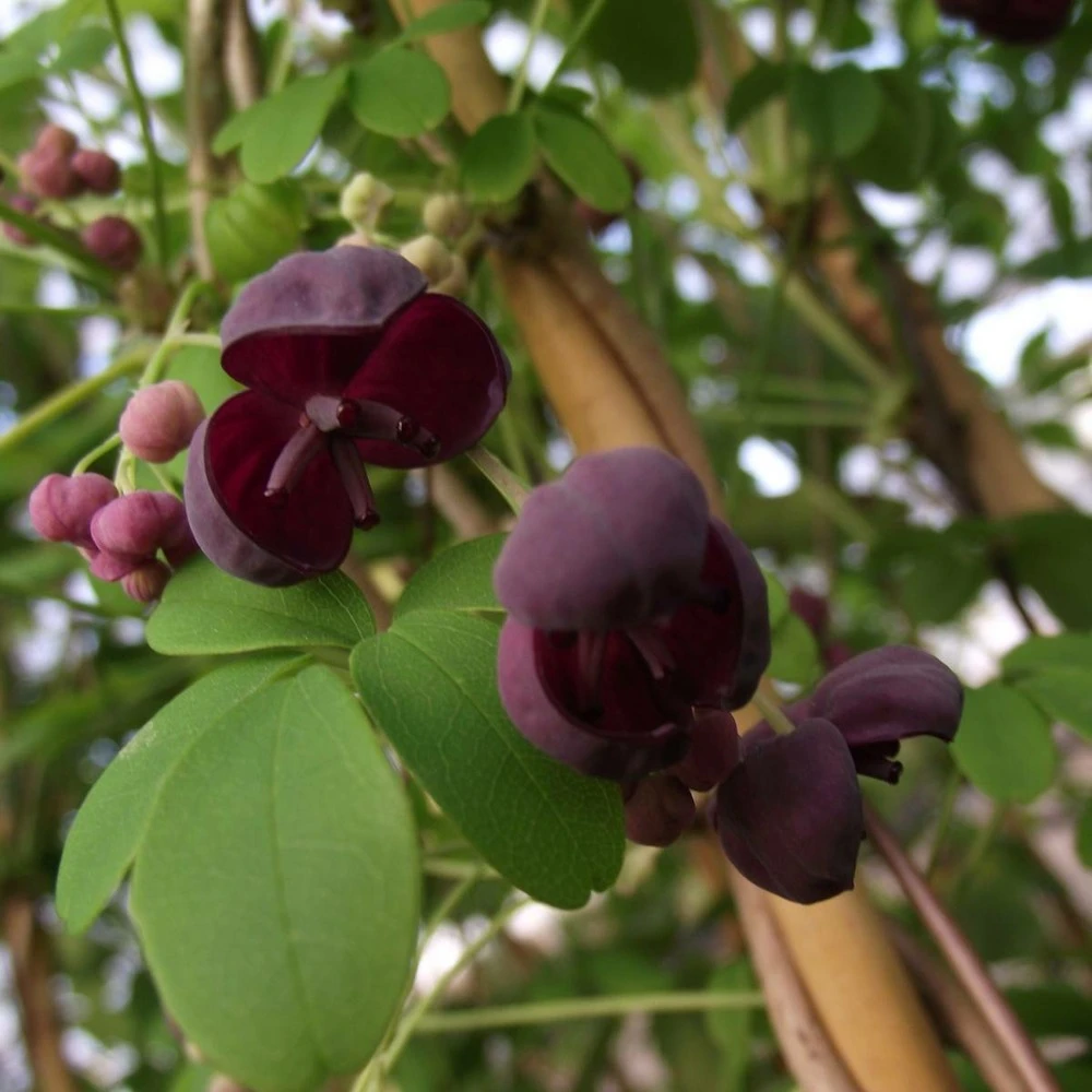 l’akébie pentaphylle dispose de feuilles à 5 folioles et de fleurs violet foncé. Cette plante produit un fruit assez long (ressemblant à un cornichon) produisant de nombreuses graines, en revanche celui-ci n’est pas déclaré comme non comestible, en revanche elle peut provoquer des douleurs abdominales.