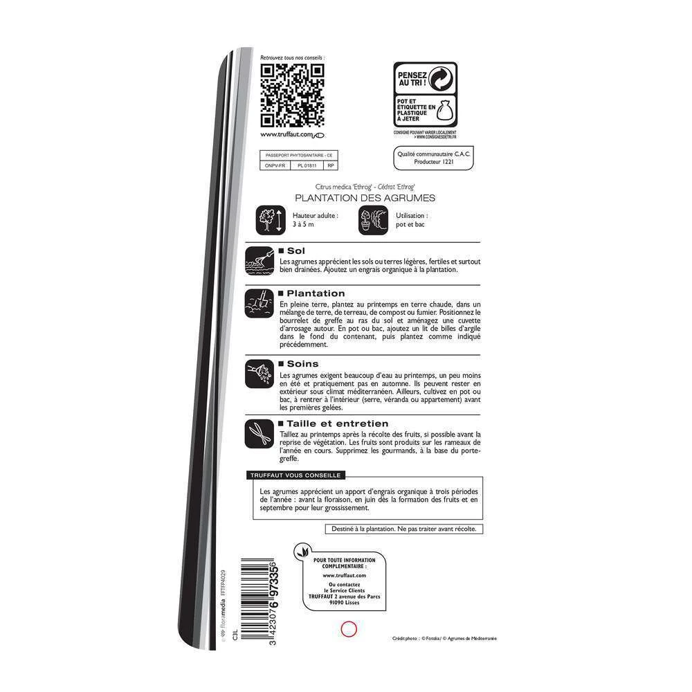Originaire du Sud-Est asiatique, le Cédratier (Citrus medica) est cultivé en Médie (d’où son nom), dès le VII ème siècle avant J.C. Il a été introduit au début de l’ère chrétienne, au Sud de l’Italie, en Sardaigne, en Sicile, en Corse où on cultive la variété: de Corse. Dans la religion israélite, le fruit sert d’offrande lors de la fête des Tabernacles.Ce petit arbre tourmenté atteint une hauteur de 3 m pour une largeur de 1,50 m. Jeunes rameaux de couleur pourpre. Feuillage persistant, vert clair. Floraison pourpre, d’avril à octobre. Fruits très gros, de 10 à 12 cm de diamètre, avec une écorce grumeleuse, jaune citron. La récolte des fruits s’échelonne de septembre à novembre. Les fruits servent à la confection de fruits confits et de liqueurs. Non rustique, il ne résiste pas à des températures inférieures à -3°C.On peut le planter en régions très chaudes, en pleine terre, dans un sol léger, perméable, bien drainé. Exposition au soleil, à l’abri des vents. Partout ailleurs, culture en pot en rentrant la plante dans une véranda tenue hors gel, à une température de 10°C environ. ‘Ethrog’ est une variété de Citrus Medica.