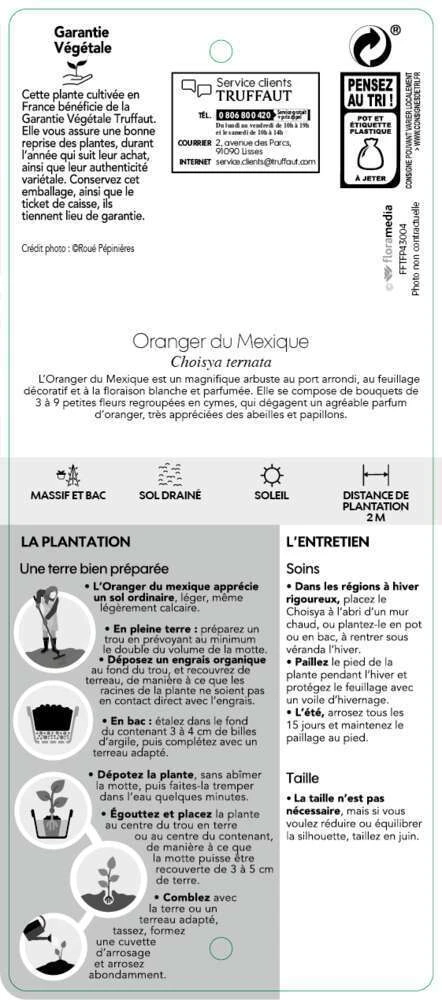 Le genre Choisya, dédié au pasteur et botaniste genevois Jacques-Denis Choisy (1799-1859), comprend 7 espèces originaires du sud ouest des Etats Unis et du Mexique. Choisya ternata ou oranger du Mexique est l’espèce la plus cultivée. Cet arbuste, au port arrondi, compact, atteint 2,50 m de hauteur pour une largeur de 2 m. Feuillage persistant, rameaux vert. Feuilles de 4 à 7 cm, à folioles ovales, odorantes. Floraison blanche, parfumée, en avril-mai, remontante en août. Fleur de 3 cm de diamètre, ressemblant à la fleur d’oranger, en cymes de 3 à 6, dépassant le feuillage. Rustique, mais ne supportant pas un froid au delà de -10 °C. A planter en situation chaude, ensoleillée, et à protéger du gel pendant l’hiver les premières années de plantation. Pousse dans un sol normal, léger, même légèrement calcaire. Exposition au soleil ou à mi-ombre. Supporte bien la taille pour la formation. On le plante en isolé, en association dans des massifs ou haies.