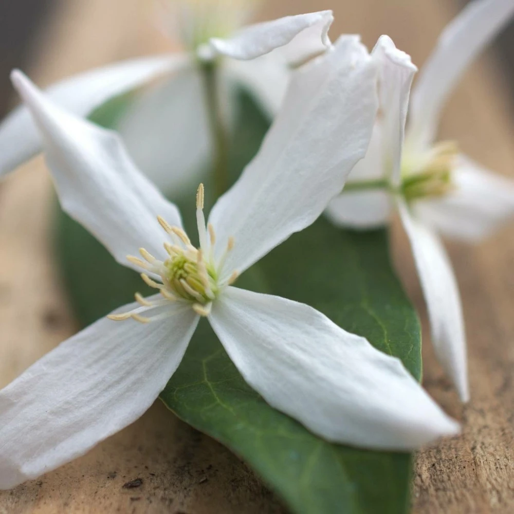 la clématite enham star est une clématite à feuillage persistant produisant de merveilleuses petites fleurs parfumées en début de printemps.