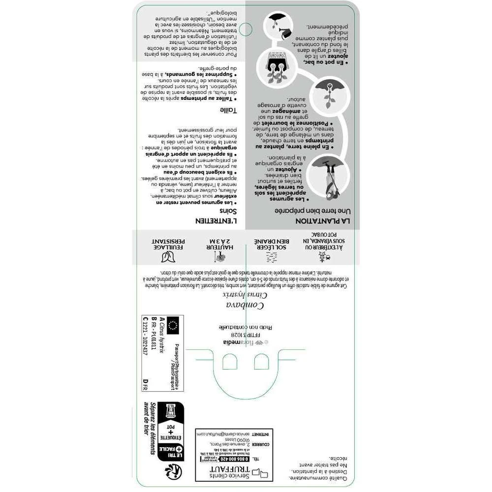 Originaire des îles indonésiennes, le combava (Citrus hystrix) n’apparait en Occident que dans la deuxième moitié du XXème siècle. L’arbre et le fruit portent le même nom. Ce petit arbre épineux atteint une hauteur de 3 m pour une largeur de 1,50 m. Feuillage persistant, vert sombre, odorant. Floraison blanche, parfumée, au printemps. Fruits ronds de 5 à 6 cm de diamètre, avec une écorce grumeleuse, vert profond, jaune à maturité. La récolte des fruits s’échelonne de septembre à novembre. L’arome intense rappelle la citronnelle. Le goût est plus acide que celui du citron. Non rustique, il ne résiste pas à des températures inférieures à -2°C.