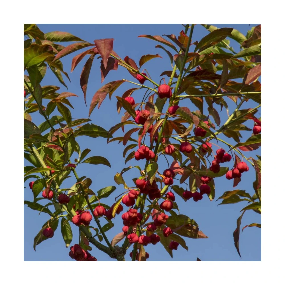 l’euonymus europaeus ou fusain d’europe est un arbuste touffu, proposant un feuillage vert caduc prenant une jolie couleur rouge à l’automne. Cet arbuste sera idéal dans une haie champêtre ou en isolé. À l’automne il se couvre de petites baies rouges.