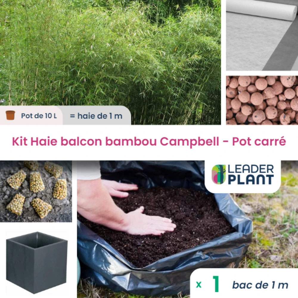 ce kit comprend : 1 bambou fargesia campbell en pot de 10 litres, 140/160cm, à planter dans un bac carré 40cmx40cmx40cm à installer sur le balcon ou la terrasse