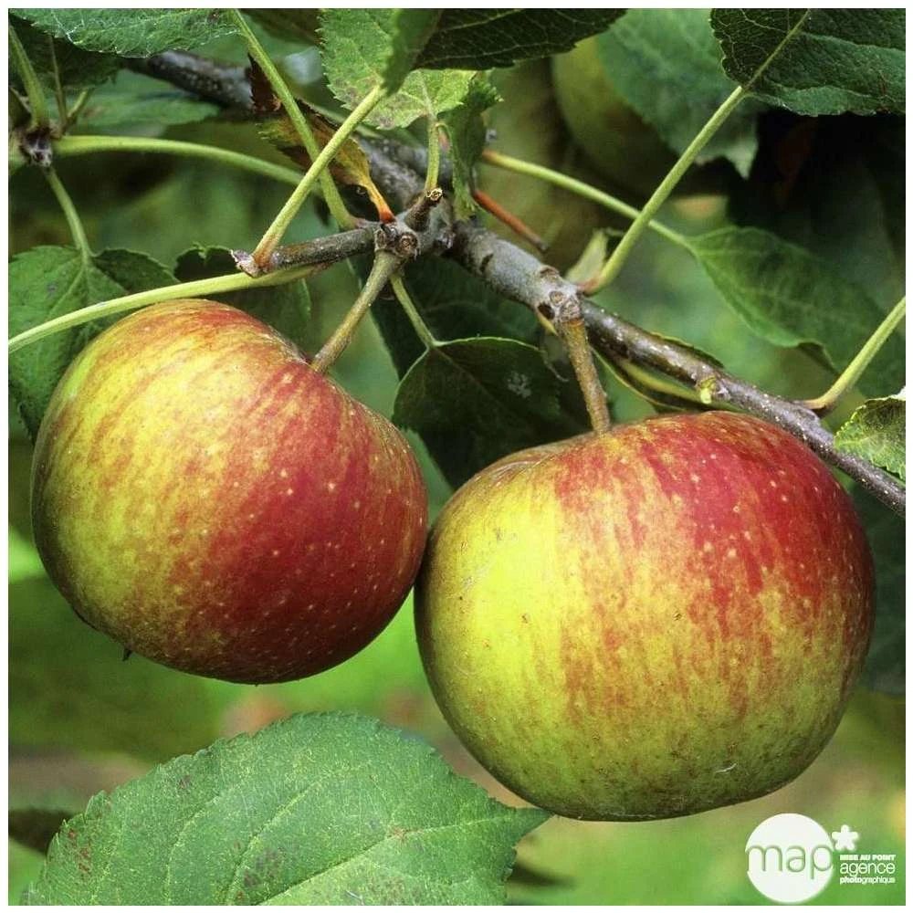 Arbre de bonne vigueur, qui a un port divergent et une très bonne fertilité. Cette variété est peu sensible au chancre et à la tavelure. Sa floraison est spectaculaire et a lieu pendant 20 jours au mois d’avril, donnant de grandes fleurs blanches. La cueillette des fruits se réalise fin octobre à début novembre. On les consomme entre décembre et mars. La peau des pommes est rugueuse, vert-jaunâtre lavé de rouge à maturité. La chair est jaunâtre, mi-ferme, juteuse, parfumée, sucrée et un peu acidulée.